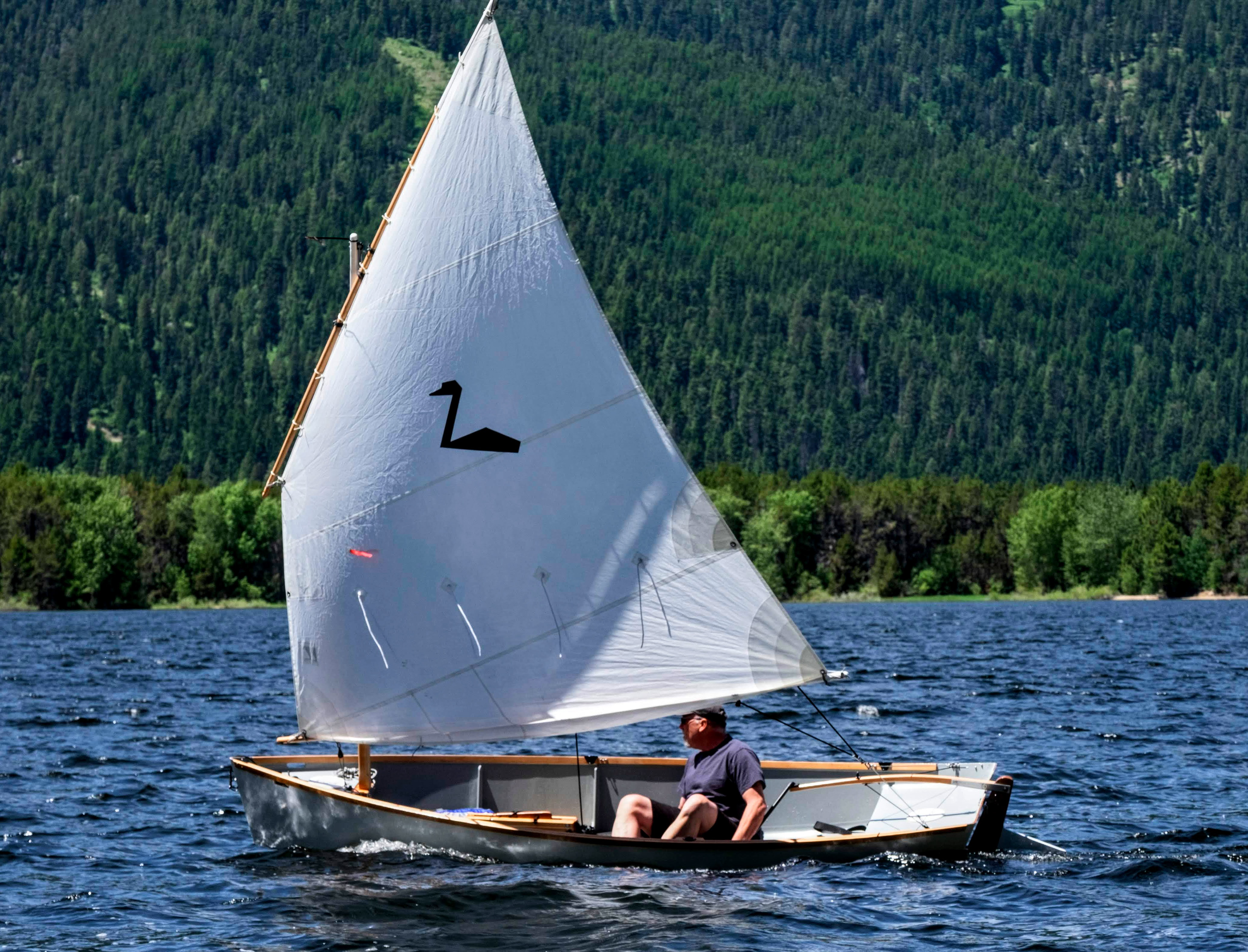 This is "Grebe", a Drake 13 Sharpie designed by Selway-Fisher. I built this boat in 2019 and sail it on Cascade Reservoir.